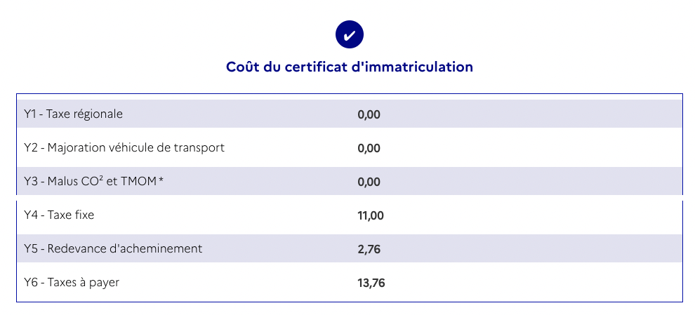 Registration cost = €13,76 (0.066% of the vehicle price).