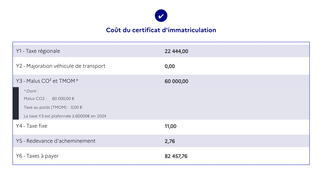Registration Cost = €82,457.76 (33% of the vehicle’s base price).